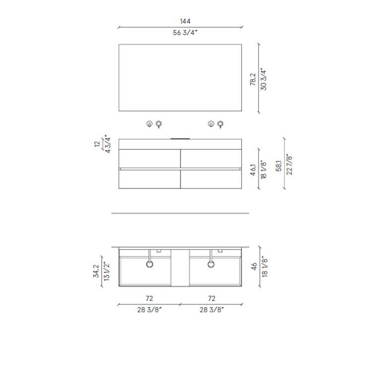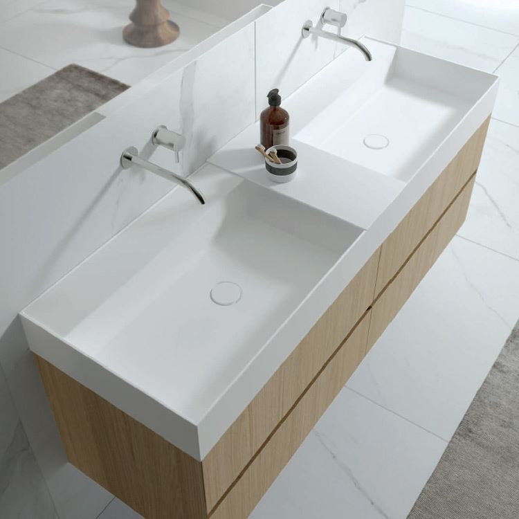 Waschtischunterschrank im Poro Rovere Naturale Farbton mit Doppelwaschbecken. Maße: L.144 P.46 H.58,1 cm